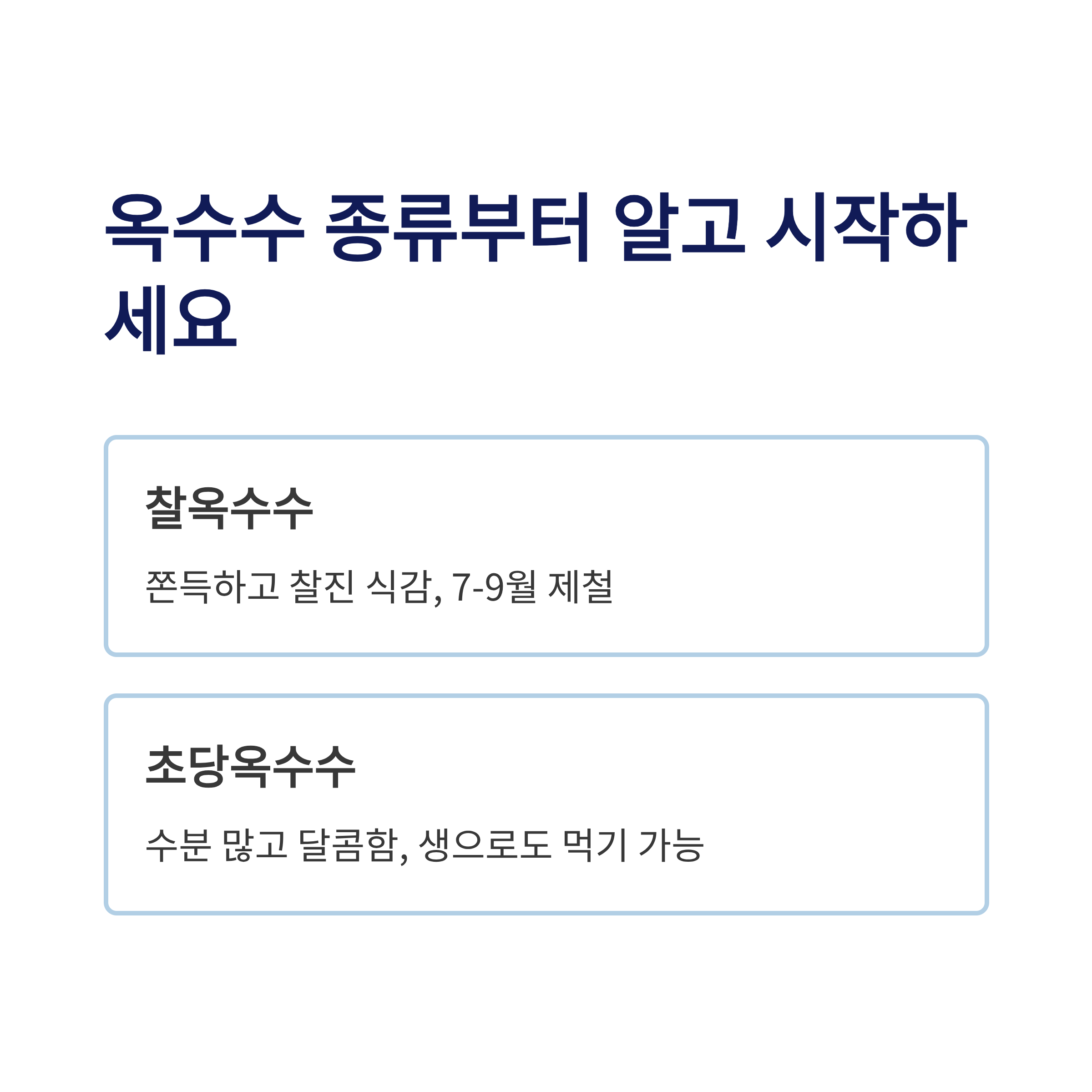 찰옥수수는 7~9월이 제철로, 알이 단단하고 씹을수록 고소한 단맛이 나요. 반면 초당옥수수는 수확 직후 당도가 높아 생으로 먹어도 맛있지만, 너무 오래 삶으면 물컹해질 수 있어 주의가 필요합니다. 📌 옥수수 삶는 방법을 시작하기 전에, 포장지나 판매자에게 어떤 종류인지 물어보세요!