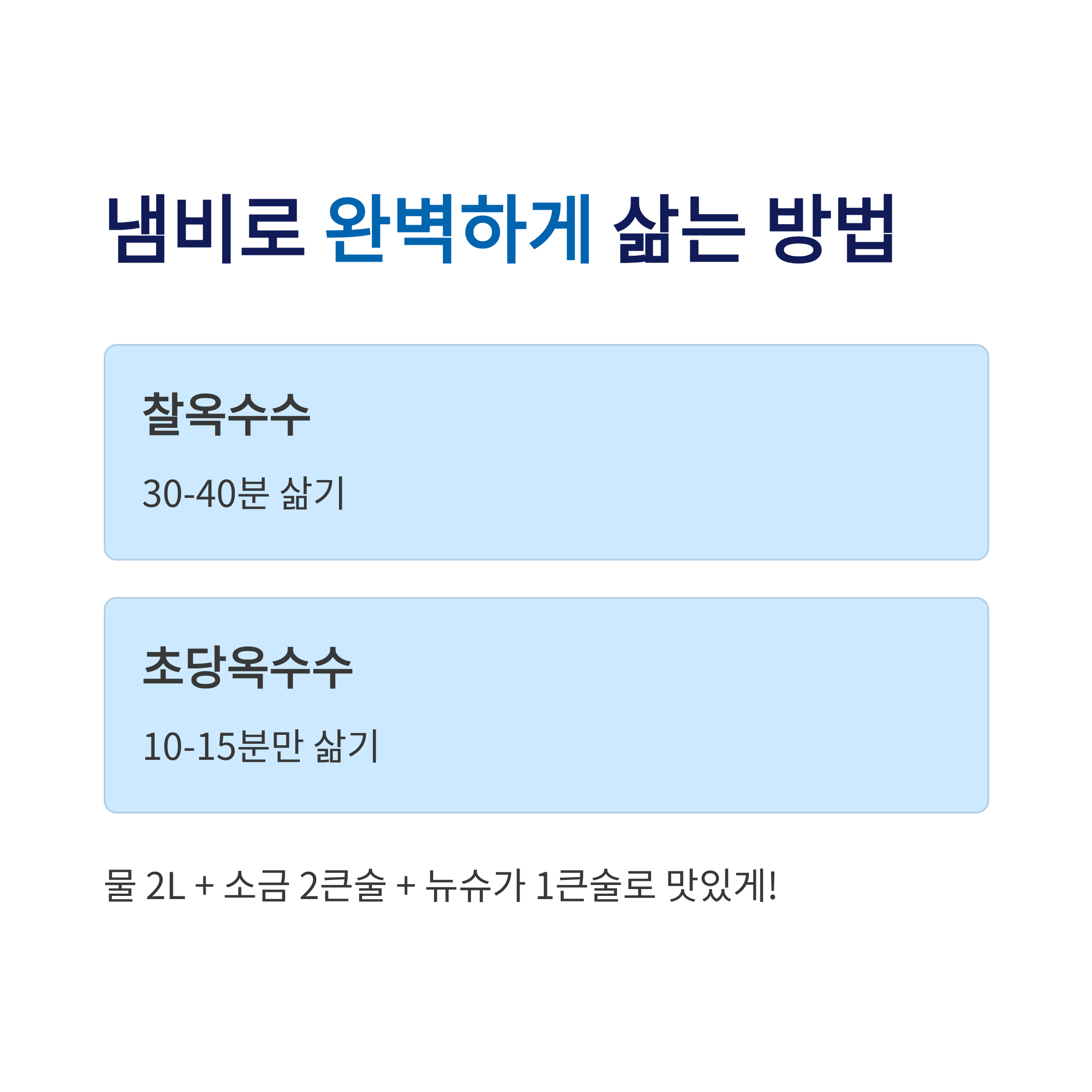 더 오래 보관하려면 삶은 후 식혀서 지퍼백에 넣어 냉동실에 저장하면 1~2개월은 거뜬히 보관 가능합니다. 먹을 때는 전자레인지에 물 한 컵과 함께 1~2분 돌리면 처음의 쫀득함이 살아나요! 🌽